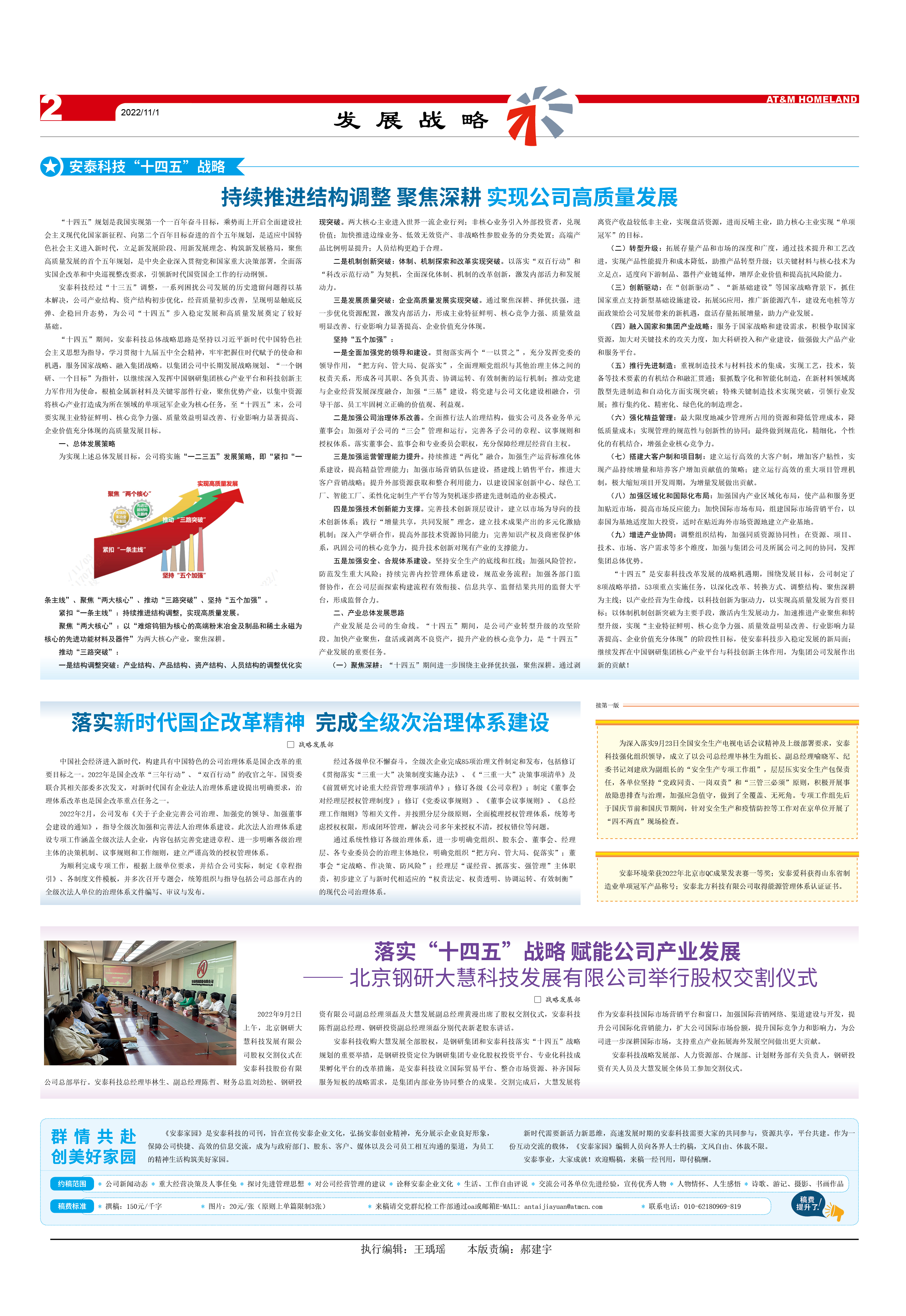 “十四五”是安泰科技改革發(fā)展的戰(zhàn)略機(jī)遇期,圍繞發(fā)展目標(biāo),公司制定了8項(xiàng)戰(zhàn)略舉措,53項(xiàng)重點(diǎn)實(shí)施任務(wù),以深化改革、轉(zhuǎn)換方式、調(diào)整結(jié)構(gòu)、聚焦深耕為主線;以產(chǎn)業(yè)經(jīng)營為生命線,以科技創(chuàng)新為驅(qū)動(dòng)力,以實(shí)現(xiàn)高質(zhì)量發(fā)展為首要目標(biāo);以體制機(jī)制創(chuàng)新突破為主要手段,激活內(nèi)生發(fā)展動(dòng)力,加速推進(jìn)產(chǎn)業(yè)聚焦和轉(zhuǎn)型升級(jí),實(shí)現(xiàn)“主業(yè)特征鮮明、核心競爭力強(qiáng)、質(zhì)量效益明顯改善、行業(yè)影響力顯著提高、企業(yè)價(jià)值充分體現(xiàn)”的階段性目標(biāo),使安泰科技步入穩(wěn)定發(fā)展的新局面;繼續(xù)發(fā)揮在中國鋼研集團(tuán)核心產(chǎn)業(yè)平臺(tái)與科技創(chuàng)新主體作用,為集團(tuán)公司發(fā)展作出新的貢獻(xiàn)!