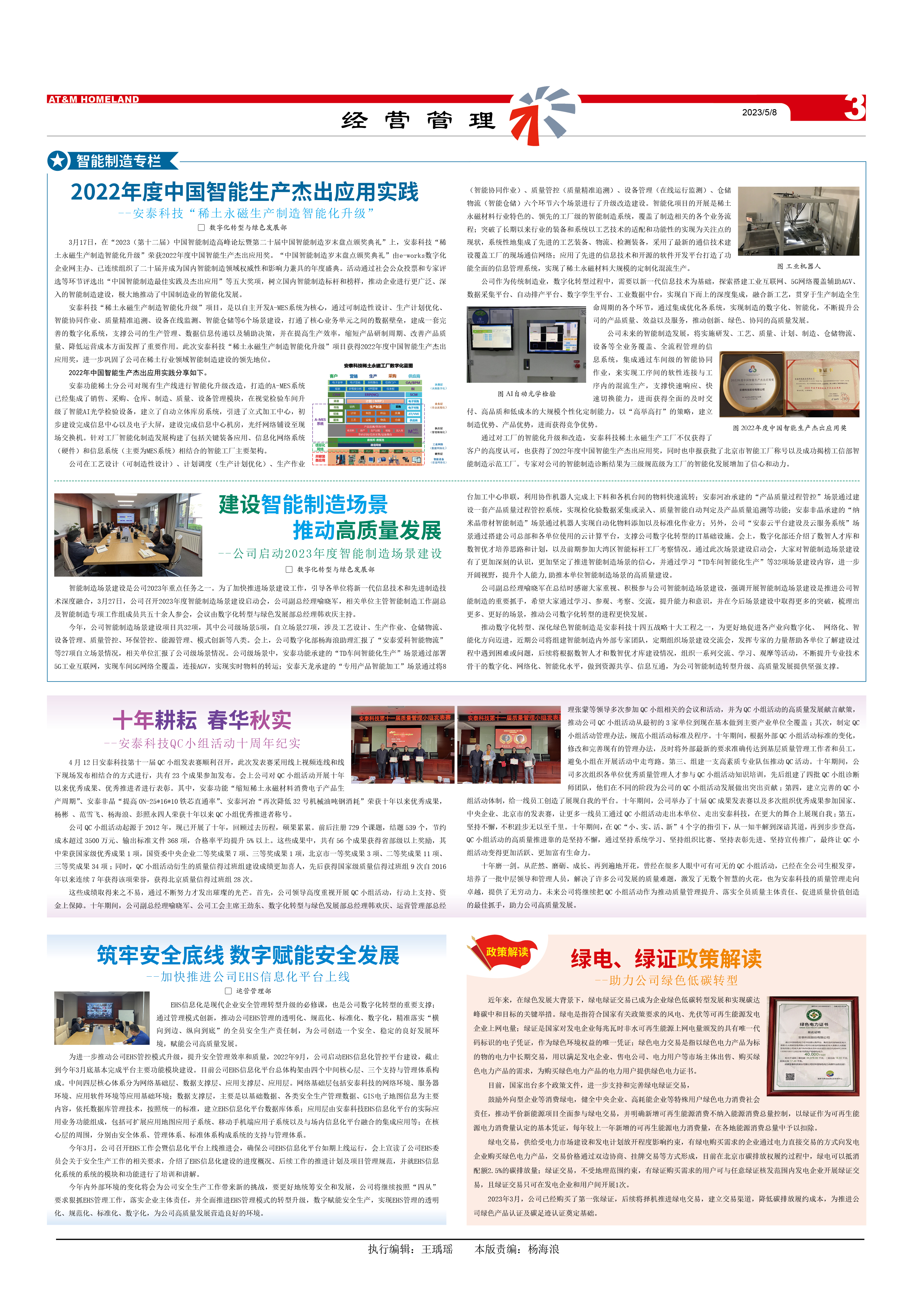 通過對工廠的智能化升級和改造,安泰科技稀土永磁生產(chǎn)工廠不僅獲得了客戶的高度認可,也獲得了2022年度中國智能生產(chǎn)杰出應(yīng)用獎,同時也申報獲批了北京市智能工廠稱號以及成功揭榜工信部智能制造示范工廠。專家對公司的智能制造診斷結(jié)果為三級規(guī)范級,為工廠的智能化發(fā)展增加了信心和動力。